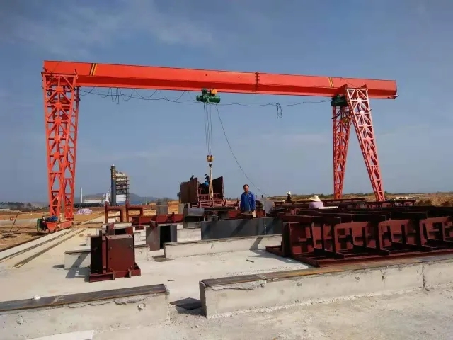 它的金屬結構像門形框架,承載主梁下安裝兩條支腳,可以直接在地面的軌道上行走,主梁兩端可以具有外伸懸臂梁。